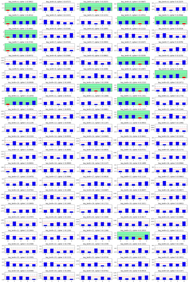 For keys of length 4~24 (inclusive), I generated 5 ciphertexts for each key length,, since the number of plaintexts in the set is 5. That is, i-th ciphertext of key length k is encrypted from i-th plaintext of the set.